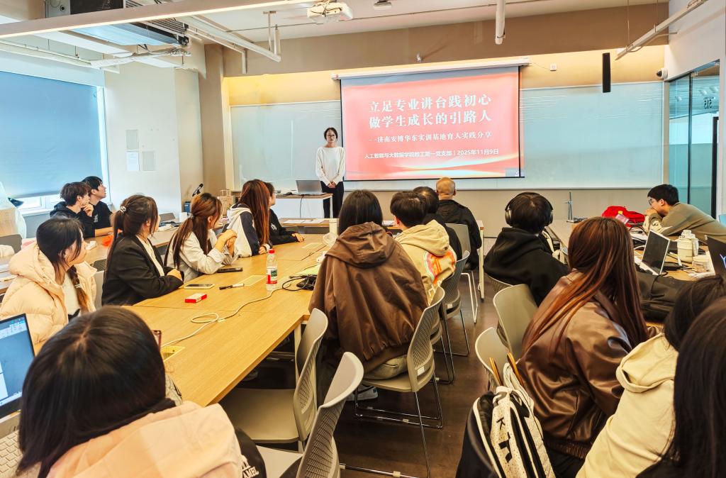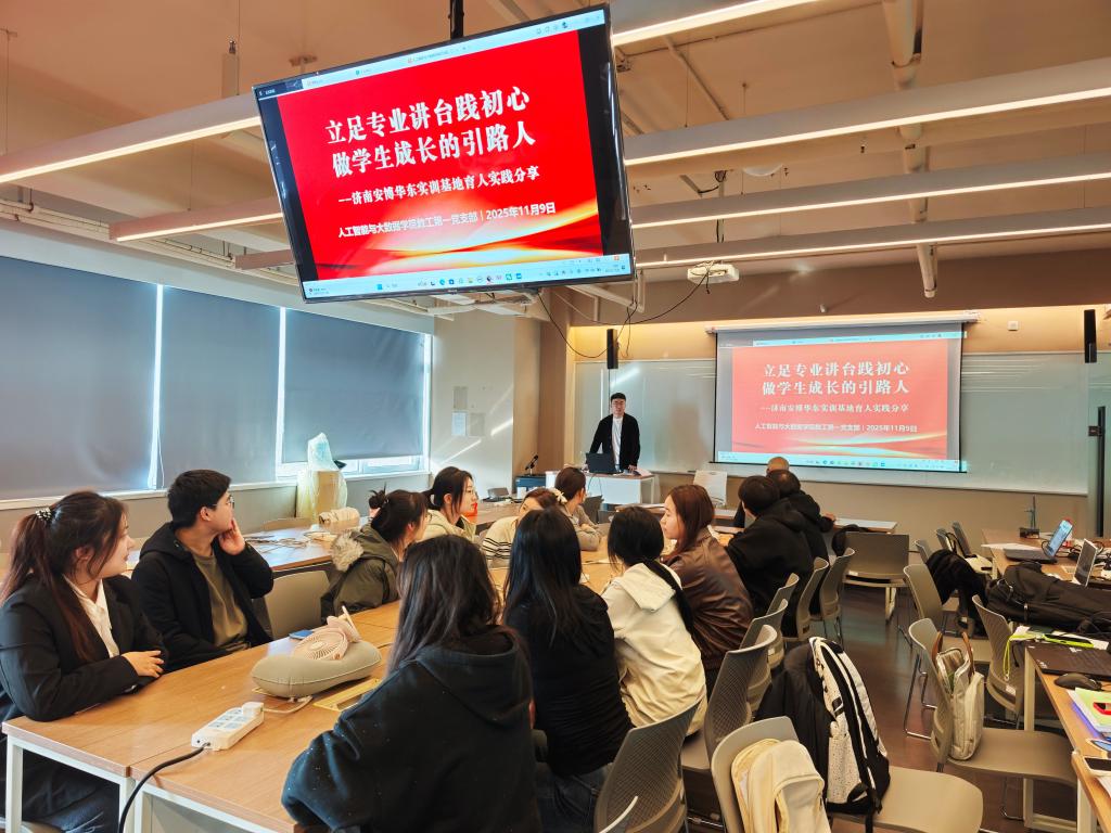 为深化党建引领作用,推动校企协同育人走实走深,2025年11月9日,人工智能与大数据学院教工第一支部党员高阳老师赴济南安博华东实训基地,为学生党员和积极分子讲授专题党课,并参与指导毕业答辩工作,实现思想引领与专业实践融合并进。