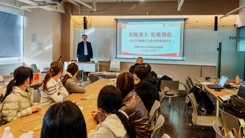 刘仁山以“实践育人,党建领航--关于产教融合与党员使命的思考”为题,为实训基地学生党员和积极分子讲授专题党课。他紧扣党的二十大精神,强调“党建领航”在推动产教融合中的核心作用,指出数字媒体技术专业学生应在实习中锤炼技能、担当责任。党课从党建引领方向、党员践行使命、专业培育匠才三个维度展开,鼓励学生党员带头攻坚克难,将初心使命融入作品创作。结合学院与安博的合作案例,他进一步阐述了“党建+实训”的实施路径,通过支部共建、党员带头等举措,实现人才培养与价值引领的统一。同学们表示将以专业实践践行“强国有我”的青春誓言。
