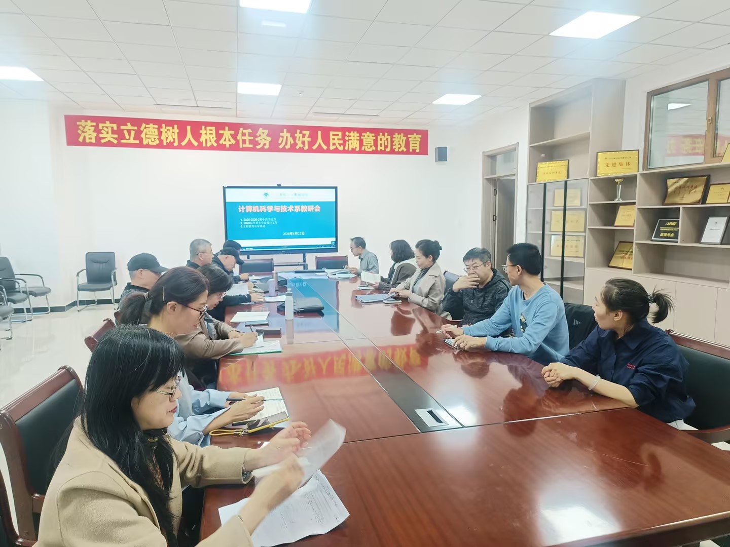 2026年4月22日下午3:50,计算机科学与技术系在产教融合北楼510会议室召开期中教研会,系主任何塔娜主持会议,全系教师参会,校督导组列席会议。
